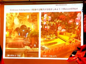 このテーマについてWALLPAPERHOUSEの大塚社長は「中国の景気減速が世界の企業業績に波及している。経済、環境、労働力などの持続可能性(サスティナビリティ)が行き詰りつつある。パイが増え成長する市場では競争することでお互いが発展することができたが、市場が拡大しない環境では競争は共食い状態を生み、その結果みんなが「成長、拡大」という目標を目指さなくなっている。そこで今度は価値観を変容して「ユートピア(理想的な考え方)」を求めるようになっている。」と語っていました。